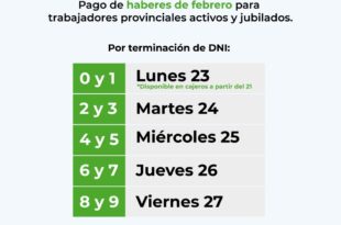 El Gobierno de Corrientes confirmó que este lunes 23 de febrero comenzó el pago de sueldos a los trabajadores estatales, activos y jubilados. Modalidad: El pago se realiza de forma escalonada por terminación de DNI (dos números …